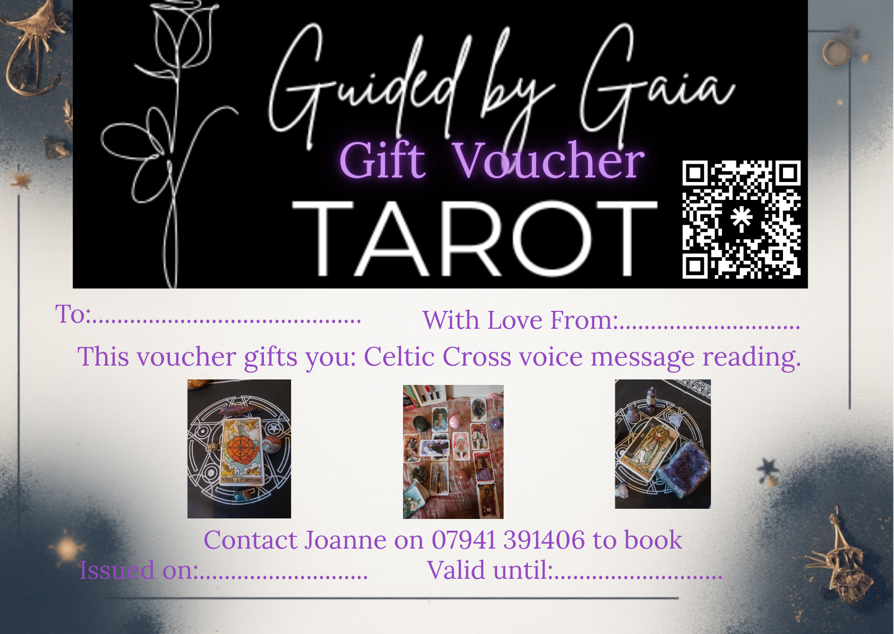 Give the gift of Guided by Gaia Tarot! This Tarot Reading Gift Voucher entitles your loved one to a 10 card Celtic Cross voice message reading of their choice.