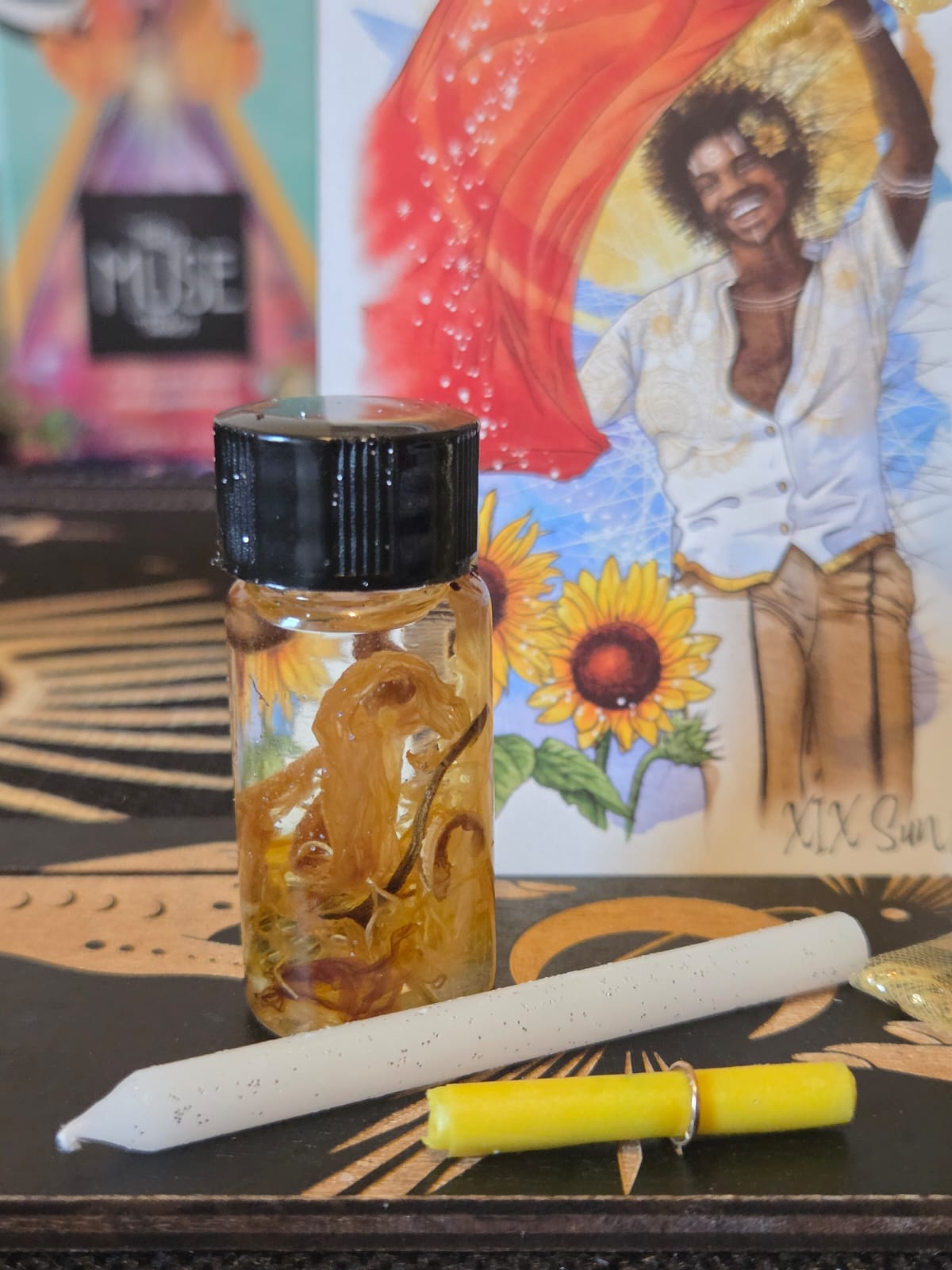 The base is sweet almond oil, blended with a magickal mix of herbs, flowers, and crystals selected for their energetic properties. Essential oils are added for both scent and spellwork — each bottle bursting with vibrant, confident energy.